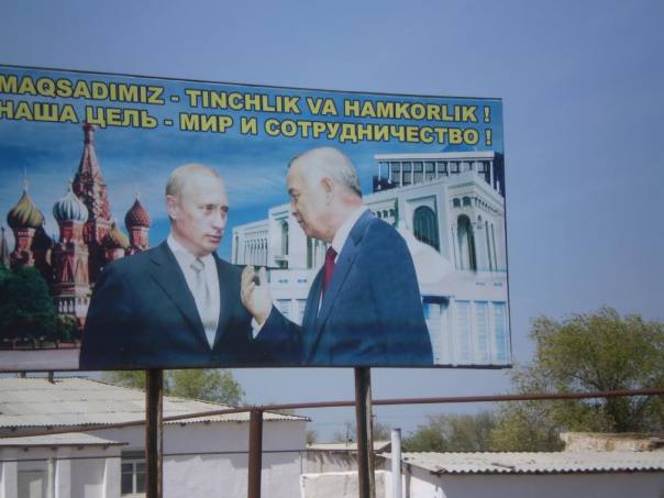 אוזבקיסטן נשלטת כיום על ידי דיקטטור פוסט-סובייטי, הנשיא איסלאם קרימוב, לשעבר ראש המפלגה הקומוניסטית של אוזבקיסטן. מבחינת חופש ודמוקרטיה מעט מאד השתנה מהתקופה הסובייטית. הנשיא שולט ביד רמה במדינה, וכרזות התעמולה שלו מתנוססות בכל פינה. קרימוב, שבעבר היה אחראי לדיכוי הקומוניסטי באוזבקיסטן, שינה את עורו לחלוטין לאחר קבלת העצמאות והפך ללאומן-אתני אוזבקי. הגיבור הלאומי אינו כבר לנין אלא האמיר טימור מהמאה ה-15, והשלטון הסובייטי מוצג על ידי התעמולה הממשלתית כקולוניאליזם נתעב. בכל זאת, לאחרונה, שינה קרימוב את האוריינטציה הבינלאומית שלו מאוריינטציה אמריקאית לרוסית, ויתכן שהתעמולה הממשלתית תשנה אף היא את עורה בעתיד הקרוב. בתמונות שצילמתי תראו את כרזות התעמולה של קרימוב, את תמונותיו ואת "ציטוטי החכמה" שלו שתלויים בכל מקום באוזבקיסטן. בתו של הנשיא, גולנארה קרימובה, היא אשת עסקים שקונה נתחים נרחבים מאוזבקיסטן, בונה חנויות יוקרה ששייכות לה ולאנשי שלומה ובאופן כללי דוחקת את האזרחים הפשוטים היכן שהיא רק יכולה. יש האומרים שהיא עתידה להיות היורשת של קרימוב. האוזבקים באופן עקרוני אינם מחבבים את נשיאם ואת בתו, בלשון המעטה, חרף התעמולה וחרף העובדה שכל סטודנט מחויב להיבחן על כתבי הנשיא כתנאי לקבלת התואר. עם זאת, רבים מהם תומכים בו כרע במיעוטו- מפני שהוא שומר בקנאות על אופיה החילוני של המדינה.