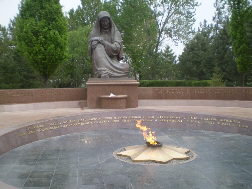 בטשקנט טיילתי קצת בעצמי וקצת עם ידידה אוזבקית, זארינה, סטודנטית מקסימה שהכרתי ביפן. זארינה, שהיתה טרודה בהכנות לחתונתה, היתה נדיבה מספיק כדי להקדיש לי כמה שעות ולהכיר לי את העיר. היא לקחה אותי לאוניברסיטה שלה, ובמיוחד למחלקת היפנית (היה מוזר קצת לדבר יפנית באוזבקיסטן ולראות פתאום סימניות יפניות), ואז הסתובבנו במרכז העיר בין המונומנטים, המבנים, הפארקים והאנדרטאות. בילינו שלוש שעות מרתקות במוזיאון האוזבקי לאומנות, וראינו את האנדרטה המרגשת לחללים האוזבקיים במלחמת העולם השנייה. אוזבקים רבים נלחמו במסגרת הצבא האדום ותרמו רבות לניצחון על הנאצים- והעם האוזבקי גאה עד היום על תרומתו לניצחון על היטלר. האנדרטה למלחמת העולם השנייה היא פסל של אם אוזבקית המתאבלת על בנה שנפל, ולידה- אש התמיד. מסביב חקוקים שמות חללי המלחמה על לוחות מתכת. אנדרטה מרשימה נוספת היא מונומנט לעצמאות אוזבקיסטן בכיכר העצמאות (לשעבר כיכר לנין), הכיכר המרכזית בטשקנט.