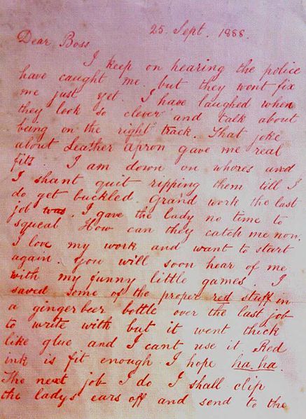אני שומע שוב ושוב כי המשטרה עלתה על עקבותי, אבל למעשה הם לא הצליחו להינעל עלי. צחקתי כאשר שמעתי שאמרו, בחוכמה מעושה, כאילו הם עלו על העקבות הנכונות. […] בא לי לרצוח זונות, ואני לא אפסיק לרטש אותן עד שיכבלו אותי בשלשלאות. העבודה האחרונה היתה מצויינת, ולא נתתי לגברת אפילו זמן לצרוח. איך הם יכולים לתפוס אותי עכשיו? אני אוהב את העבודה שלי. אני רוצה להתחיל פעם נוספת. בקרוב תשמע ממני עם המשחקים הקטנים והמשעשעים שלי. […] בפעם הבאה אני מתכוון לשלוח את האוזניים של הגברת למשטרה רק בשביל השעשוע שבדבר. שמרו על המכתב הזה עד שאחזור לעבודה, ואז פרסמו אותו, בסדר? הסכין שלי כל כך חדה ונחמדה, ואני רוצה לחזור לעבודה מיד אם תהיה לי הזדמנות. בהצלחה.