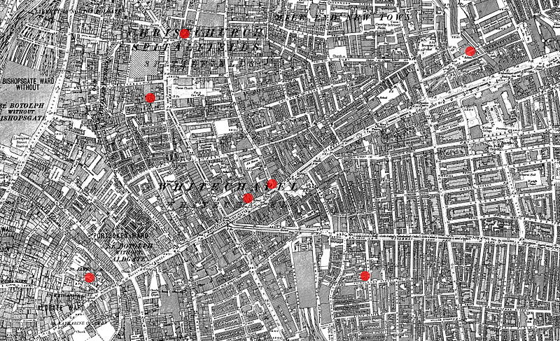 מפה של אזור וייטצ'אפל. הנקודות האדומות מסמנות שבע זירות רצח שיוחסו לג'ק המרטש, אם כי רק חמישה מהמקרים הם "קאנוניים".