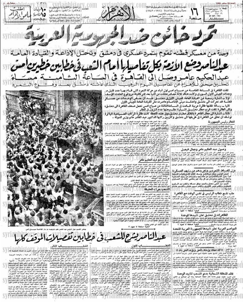 רבים מתושבי דמשק, ששמעו ברדיו את ההודעה של "הפיקוד הערבי המהפכני העליון" על התנתקות ממצרים, גירוש אנשיו של נאצר מסוריה ומעצרים של "אויבי העם", דווקא לא הצטערו כל כך במיוחד. האיחוד עם קהיר, שהתקבל ב-1958 בתרועות ובמחולות, החמיץ ואיבד פופולריות במהירות כמו יוגורט מצרי מסובסד ביום קיץ חם. אף כי הנשיא נאצר היה פופולרי בסוריה, תושביה סלדו מהזרם הבלתי פוסק של קצינים, שוטרים ובירוקרטים מצרים שבאו לנהל כל היבט והיבט בחייהם. כפי שכתב דיפלומט יפני שהוצב בדמשק באותה תקופה, "מצרים התייחסה לסוריה כאילו היתה קולוניה." מעבר לכך, הכלכלית הסורית נטתה להיות פתוחה יותר מזו המצרית, והמפגש בין שני המשקים לא הוביל לתוצאות חיוביות. נשיא מצרים ויועציו מיהרו להחיל בסוריה "חקיקה חברתית" שנועדה לשיטתם להטיב עם המוני העם, אולם בפועל קנתה את איבתם של סוחרים רבים שמצאו את עצמם לכודים בבירוקרטיה סוציאליסטית אטומה ומסורבלת.
