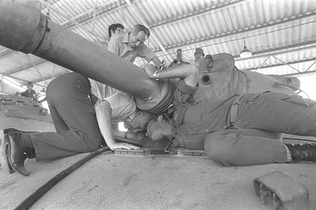 אם תקבלו פקודה לחבל בטנק, האם תבצעו? בתמונה: הנשיא אפרים קציר ושר הביטחון שמעון פרס בוחנים טנקים בבסיס של חיל החימוש. קרדיט: סער יעקב, לשכת העיתונות הממשלתית.
