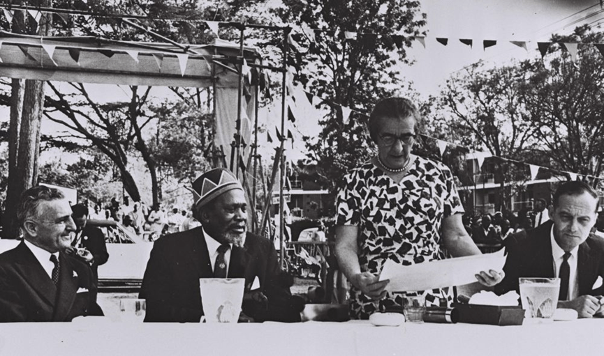 גולדה מאיר וג'ומו קניאטה בטקס הנחת אבן פינה לשגרירות ישראלית, 9 בדצמבר 1963.